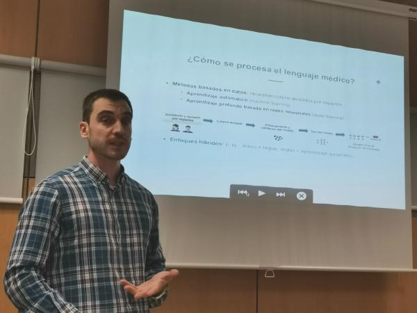 La primera sesión corrió a cargo de Leonardo Campillos, con el título de Procesamiento del lenguaje médico en español: contribuciones y desafíos. Se planteó el procesamiento del lenguaje natural (conocido como PLN) aplicado al dominio de la medicina desde un enfoque divulgativo. A partir de casos de uso como la extracción de información en anuncios de ensayos clínicos, redes sociales o agentes conversacionales se plantearon los métodos principales y las dificultades habituales, como la ambigüedad semántica o la variedad terminológica.