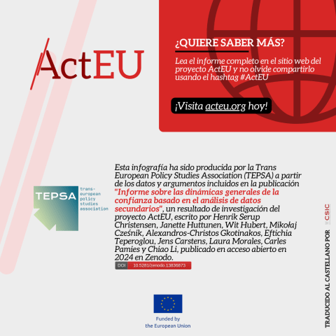 Para analizar esta compleja realidad, la Trans European Policy Studies Association (TEPSA) ha publicado dos infografías basadas en los hallazgos del "Informe sobre las dinámicas generales de la confianza basado en el análisis de datos secundarios" (“Report on the general dynamics of trust based on secondary data analysis”), resultado del proyecto de investigación ActEU en el que participan desde el Instituto de Políticas y Bienes Públicos del CSIC, Laura Morales y Carles Pamiés, coautores del informe. las imágenes se difunden en redes sociales como una herramienta accesible y visual para comprender las dinámicas de confianza política en Europa