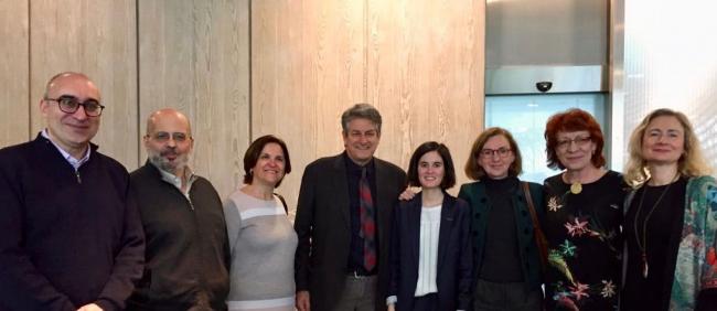 Miembros del tribunal y directores de tesis (de izquierda a derecha): Dr. Domingo Ródenas (Univ. Pomeu Fabra); Dr. Jaime Brihuega (Univ. Complutense); Dra. Dolores Romero (Univ. Complutense); Enric Bou (Univ. Ca' Foscari); Dra. María Dolores Jiménez-Blanco (Univ. Complutense); Dra. Concha Lomba (Univ. de Zaragoza) y Dra. Pura Fernández (Consejo Superior de Investigaciones Científicas).