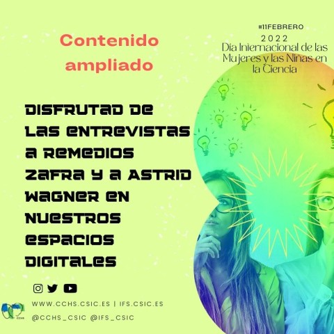 - Entrevistas en vídeo. Las investigadoras del Instituto de Filosofía Remedios Zafra y Astrid Wagner reflexionan en sendos vídeos online disponibles en el canal de Youtube del CCHS y en la red social Twitter sobre la necesidad de referentes femeninos en la ciencia, y en el papel de las humanidades y las ciencias sociales para avanzar en la participación plena de las mujeres en el ámbito de la I+D.