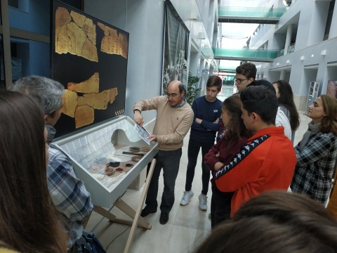 A continuación, la visita por el CCHS prosiguió en el vestíbulo principal con las explicaciones del egiptólogo José Manuel Galán (ILC, CCHS-CSIC) acerca de su carrera científica así como de algunos de los hallazgos del proyecto Djehuty.